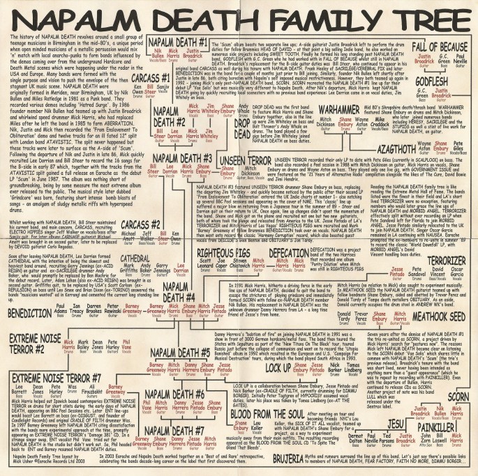 When getting into more extreme forms of metal, I’d often heard that the grindcore innovating band Napalm Death was an essential listen. With that in mind, I was off to the local Sunrise Records, and grabbed their Noise For Music’s Sake 2-CD compilation. Aside from being a great introduction to a band that remains one of my favorites in metal, the package encased the following family tree that traces projects involving Napalm band members past and present.