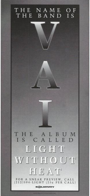 So why did the ad print with Light Without Heat as the album title? I still haven’t figured it out. I thought it may have been pulled from a lyric on the album, but I don’t see it listed. Could it have to do with the Russian play of the same name? The album is full of religious references, so is it in reference to the burning bush in which God appeared to Moses? It could simply have been a working title Steve Vai would slap onto something until a better idea formed. After all, he must have had at least a minor obsession with the phrase, using it as a label to release a significant portion of his discography.