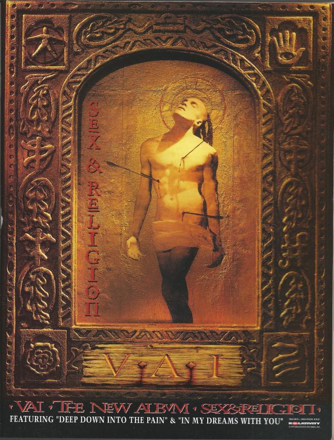 It’s a slightly modified version of the album cover. That being the case, I never noticed until seeing this image that the border around the nearly-nude man with the arrows in him (Devin Townsend) subtlely contains the word “Vai” repeated in a loop. Between the feature article and stunning ad, there’s so much detail this time around.