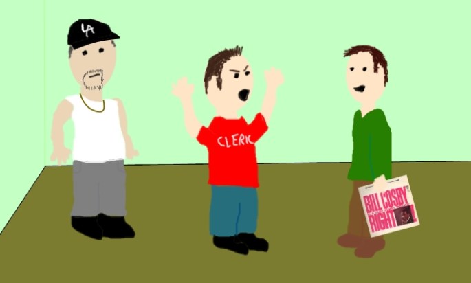 For those who are more picture-oriented, here’s an illustrated version of a quality one might expect to find on a third-grader’s book report. I’m the only person with eyebrows given that I was the only one acting overly emotional. The house was also more crowded and furnished, but my Cleric t-shirt is about as good as it’s gonna get for detail.
