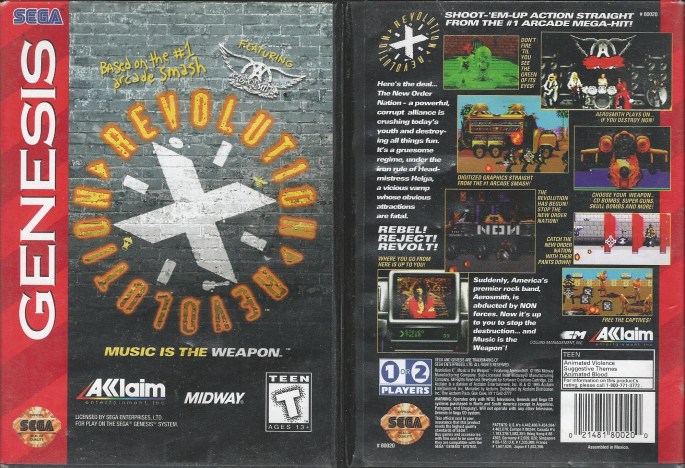 Many musicians spend time developing either a sound or a look that give them an almost other-worldly vibe that could naturally lend itself to the world of gaming. I could see shock-rockers such as Alice Cooper or King Diamond thrusted into the digitized gothic worlds portrayed in the Castlevania series, or even (to go less mainstream) Chakan: The Forever Man. How about the lads in Devo whipping their way through a River City Ransom style beat’em up? A B-52s-themed flight simulator? My computer programming skills are far too primitive to create such games for my own enjoyment, so I have to make due with what is already in existence. I’ve had exposure to a number of games that feature musicians prominently in them, so I’d like to talk about some of these games, and give my personal insights and experiences surrounding them. Let’s start with Revolution X.