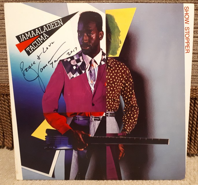 I decided to bring a record of his with me to the show to get signed. The album I selected, Show Stopper, was an apt description for his performance with the trio. Tacuma brought a strong energy and groove to the group in addition to the high technicality level evident in his soloing, holding his own up there with some other great bass soloists I’ve seen live (Stanley Clarke and John Patitucci also standing out in my mind). His wife took a picture of my brother and I posing with Jamaaladeen holding the freshly-autographed albums we brought with us (Jukebox being the other album). It may be worth tracking her down to see if she still has a copy of the picture. For now, this picture will have to do. And for those curious, he still dresses as sharply as he does on those album covers.