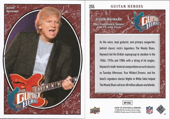 The content on these cards is decently descriptive, giving just enough for the reader to latch onto to explore the guitarist’s music. A bit more detail would have been appreciated, which would have been possible with less spacing in between the lines. On the above Justin Hayward card in particular, a name of a film or show he composed music for would have been useful. On the other hand, having learning that most of these credits were simply authorizing the use of “Nights in White Satin”, I’ll spare them my contempt and assume that’s why they saved the ink. I do like the red marble texture that’s used, and the gray text box on the rear of the card is reminiscent of how a commemorative plaque would be displayed in the Rock and Roll Hall of Fame, Hard Rock Cafe, or other similar attractions.