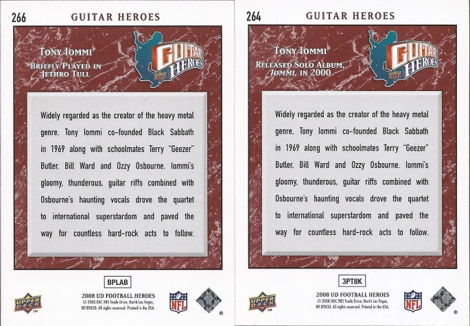 Returning back to the 2008 Guitar Heroes, let me demonstrate that while they had the right idea, their corner-cutting handicapped what made for an interesting throwback set. Here are the two Tony Iommi cards I purchased.