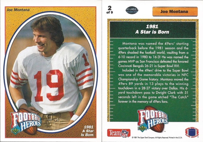 If you bought sports cards regularly as a kid, this set probably seems familiar to you. The main inspiration for these Heroes cards is the Football Heroes cards that were released as part of Upper Deck’s inaugural football set in 1991. The insert set celebrated the careers of quarterbacks Joe Montana and Joe Namath. Upper Deck also had similar sets for legendary baseball players, beginning with one of Reggie Jackson in 1990, and featured, among others, Nolan Ryan and Willie Mays in future editions of the Heroes insert sets. Here’s one such a card from my collection, highlighting Joe Montana in his breakout year in the NFL in 1981. Which reminds me, speaking of breakouts, that as a teenager I briefly had this butt-ugly poster of Montana on my bedroom wall.