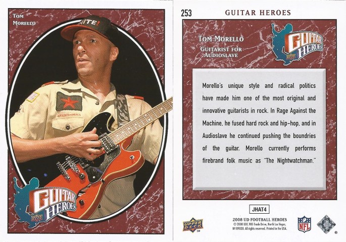 I made a trip to the local Long & McQuade musical instruments store (who do not sell records or CDs), but there was a sports card store directly across the street that I had been meaning to check out. Being the eve of the first Sunday in the NFL season, I had football on the brain, so went into the shop (Frozen Heroes Sportscards and Memorabilia) with the hope of finding some Chicago Bears cards to bulk up my meager collection. They kept their football cards in boxes sorted by set, and I came across a short stack of 2008 Upper Deck Heroes cards. A quick Bears hunt landed a Jim McMahon, but then came the unexpected: a trio of rock stars. In the same set as the football guys, of all places. That’s not to say that McMahon wasn’t a rock star in his own right, and he certainly had the rebellious spirit of one, but it’s also safe to say that Tom Morello wouldn’t be able to rage against the machine that is an NFL-caliber defense.