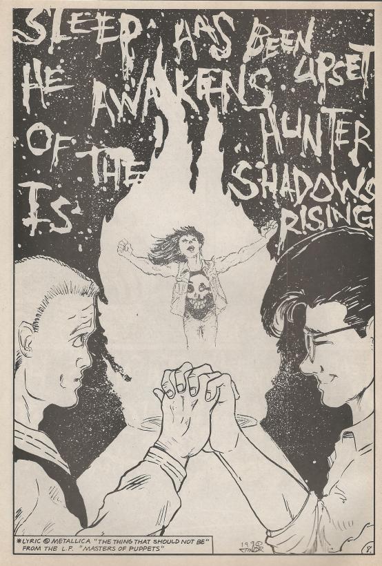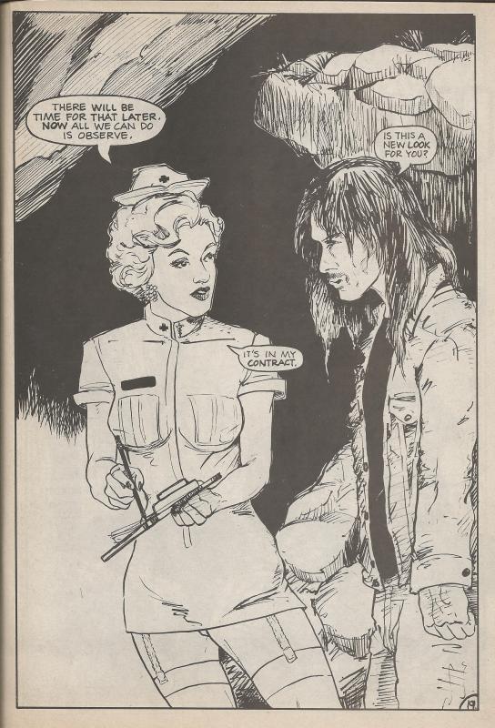 The second story has a few pages of a prologue of sorts. It show Cliff Burton in the afterlife, where an angel-like figure tells Cliff of the super powers his friends (the four members of Metallica) have back on Earth. For some reason, the woman’s appearance transforms from the beginning to the end to look less angelic and more like Madonna dressed in a sexy nurse’s uniform. It makes sense in a way considering she calls herself Nurse Julia, but the Madonna resemblance has me wondering if that was typical of her stage attire at one point or if I’m getting things confused with Weird Al’s “Like A Surgeon” video.