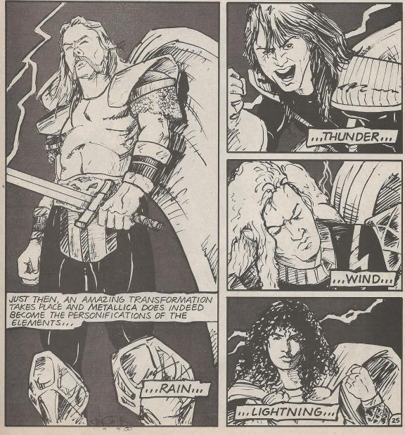 The Metallica members wait for Nurse Julia’s signal before they can take action. It seems rather strange that she doesn’t ask them to intervene until virtually everybody in the park had been reduced to roadkill, or even that she doesn’t use her medical training to assist anybody, but at least she eventually aids Metallica. Each one of them transforms to take on a power of one of the Earth’s elements, with James Hetfield granted the power of rain, Lars Ulrich gets the thunder, Jason Newsted the wind, and Kirk Hammett the lightning. By this point in the story, it was beginning to feel like a Captain Planet / Metalocalypse crossover episode.