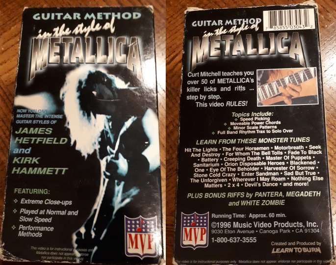 Next, one of us acquired his Metallica tape. We may have co-owned that one actually, which is something I’m sure other twins can relate to doing when you either both want something bad enough or both your names are slapped onto the same present. This time, we were already familiar with Metallica’s albums before grabbing that video. We already knew how to play a good amount of Metallica’s material based on whatever tabs we could find, so we mostly wanted this one because we were impressed enough by his Van Halen video that we were curious about how this one would be. Once again, he’s got the technique and tone down fairly well. He takes some liberties in the material where it’s not quite the way they sound on the albums, but that could be where the “In the Style Of” portion of the titles comes from. I don’t know if any of the artists were eligible to get money from these tapes or if any of them really cared, so perhaps some differences kept him protected legally, but I haven’t looked too deeply into copyright law. There are also certain riffs he tackled that weren’t guitar parts, but were rather transcribed for guitar for instructional purposes. Knowing what I know now, the intro melody of “For Whom The Bell Tolls” is a bass part, but he shows it on guitar. A purist may scoff at the idea, but adapting any musical idea onto a different instrument is never a bad idea in my opinion. Besides, I thought that intro was guitar until I saw them play the song on yet another VHS tape, A Year and A Life in the Life of Metallica.