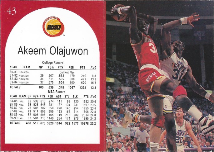 The next two pages are typical trading card content with a list of college and NBA statistics in addition to an action shot of the player. The arch pattern is really no different from the NBA Hoops card set from the same year. For the sake of an additional visual reference, behold the numbers of Hakeem (then going by Akeem) Olajuwon and a photo of “The Dream” battling Karl “The Mailman” Malone.