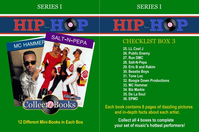 I left Vanilla Ice off out of personal taste and since he didn’t break until the latter half of 1990 (unlike MC Hammer’s earlier waves that year), there were still plenty of contenders available. NWA would be a controversial inclusion as an early example of gangster rap, and I would ideally include them, but excluded them out of censorship in a manner of speaking. I’m not sure if the Scholastic Corporation would look too kindly on the inevitable explaining of their name or their notorious “Fuck Tha Police” to qualify it for their book orders catalogs. Besides, several artists, even ones I included like Public Enemy and Boogie Down Productions, passed along social commentary through somewhat less abrasive means. My Beastie Boys inclusion would feature images from the Paul’s Boutique era because it seems that the few music card sets in existence would still show them in their Licensed To Ill style, which was horribly dated by the time. The album had less promotion and chart success than their debut full-length as a possible result from leaving Def Jam Records, but it’s my set and felt I had to include them. The fact they left their frat boy, party-hard image behind them could only be seen as a positive for a kid’s book, right?