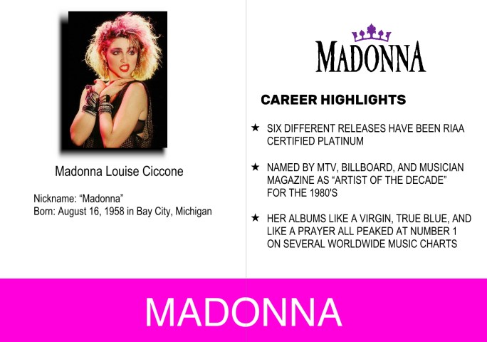Madonna was and continues to be a polarizing figure, but talking about pop music of the time would be incomplete without putting her in the discussion. I envision this book as one that would pre-date her notorious Erotica album and Sex book, which more than likely disqualify her from being in material marketed towards kids. Then again, the video for “Like a Prayer” was also considered very controversial. But I already made the book, so it wouldn’t be fair for me to take it back. I liked the quote I put on the back, but I never verified the year that this or any of the quotes came from.
