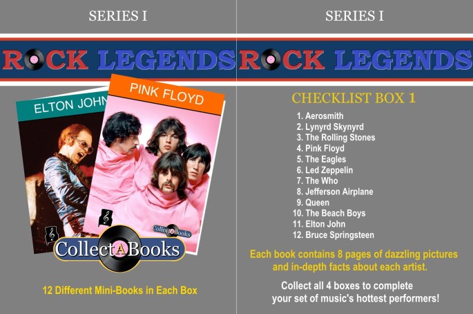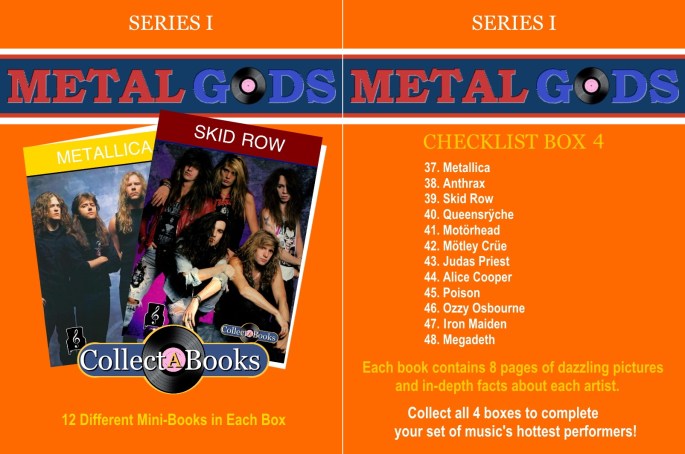 Now comes the point where I bring this towards music. I never owned any pocket-sized books that related to the music world, so using these NBA Hoops Collect-A-Books as a template, I thought it would be fun to create some. Mirroring the idea of four separate boxes with twelve books in each, I think a good idea would be to sub-divide them into different genres. I’ll go with the following: Rock Legends, Pop Stars, Hip-Hop, and Metal Gods. Since these were aimed at younger audiences, I doubt there would be much call for jazz, folk, or polka. I realize that with sets like these that there could be licensing issues, so there are some artists like The Beatles, Elvis Presley, or Michael Jackson that would be rather difficult in obtaining the rights for their usage. If you have any issues with who I included or excluded, keep in mind that may have been factored into my decision.