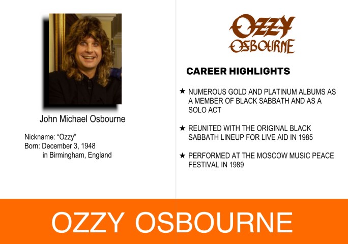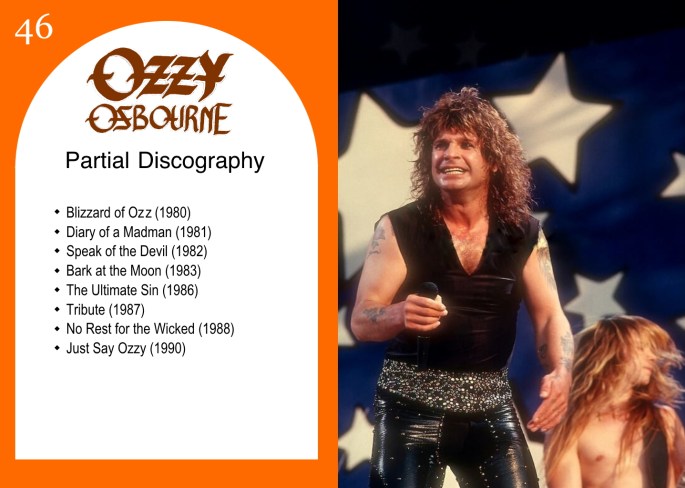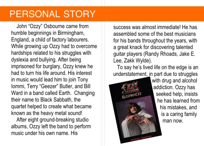 Ozzy Osbourne has an extensive enough history between Black Sabbath and his solo career that the limited space in these books can’t contain in full, and I wasn’t sure how to balance the music content with his other antics, so I kept it simple. I also didn’t want to get into all the details of the kid-unfriendly incidents live the dove and bat bitings, the Alamo urinating, or the ant-snorting. For the memorabilia, I chose one photo that did not fit the No Rest For The Wicked theme when I stumbled across a cool-looking vintage tour program from Blizzard of Ozz.