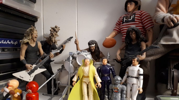 Here’s how I’ve got it set up currently, with Lars bashing the skins with the band surrounding him. Well, the band, some Buck Rogers in the 25th Century characters, Daredevil, the infamous Master Roshi from the Dragon Ball franchise, and a Moe Howard doll from The Three Stooges as he appeared in the classic short “Three Little Pigskins” along with some others that are slightly out-of-frame. Jason’s headbanging mop of hair and James’ amped-up facial expression do wonders to imply that the boys are giving these onlookers one heck of a show!