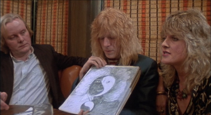 Her idea is that each band member will dress according to their zodiac sign. What I like the most with this scene that it shows the division and tensions growing in the band so well. Nigel is just sick of this shit (both the idea and putting up with Jeanine), constantly rolling his eyes and inwardly wishing he was anywhere but there. Ian, who is seemingly being usurped by Jeanine as manager, shuts the idea down due to the cost involved in dressing them up as “animals”. Bassist Derek Smalls and Viv seemed open to the idea even if only just slightly. Even David seems to be somewhat half-heartedly showing enthusiasm based on the tone of voice he adopts while he flips through the sketches. David does his best to sell Jeanine’s vision (“I wish I were a cancer”), but it’s seems like he’s been put up to doing this. That could be me reading into a combative relationship that is more of a slow boil, a man whose soul is dying bit by bit as his girlfriend seeks more creative control, but I can’t really watch this scene thinking otherwise. It’s not chock-full of humour, but ends strong with Nigel making a great call-back from an earlier point in the movie where Jeanine mispronounced Dolby as “Dubly”.