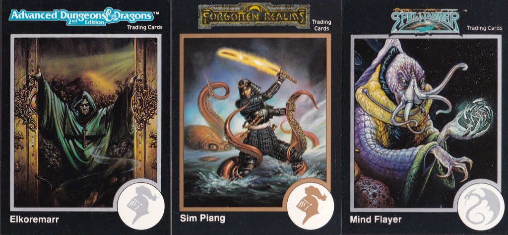 It turns out that Caldwell did the art on the Sim Piang card, which was a painting of his titled “Blade of the Young Samurai.” The other two cards’ art was handled by Jeff Easley. The Elkoremarr character is taken from a painting called “Abandon Hope,” whose title I assume his cards’ description was derived. Expecting to return home from his tower in one piece is like expecting to find more than three raisins in your first pour of Raisin Bran cereal. The Mind Flayer is the right-most character in the painting “Adventures in Space.” I don’t mind the cropping this time around because he is hands down the coolest-looking of the characters, and he must know it if he truly does view himself as being of a “superior race.”