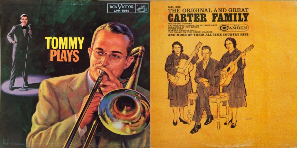 Here are a pair of covers that stood out to me, both of which are compilation records, one by Frank Sinatra with the Tommy Dorsey Orchestra and the other by The Carter Family. Hector’s take on Tommy Plays-Frankie Sings I think is superior to the standard photo of Frank Sinatra used on most other covers of what was originally titled Frankie and Tommy, rightfully giving Tommy a place on the cover (and in primary focus, too!) The Carter Family drawing is more minimal and arguably drab, but I’d say suits their folk style quite well.