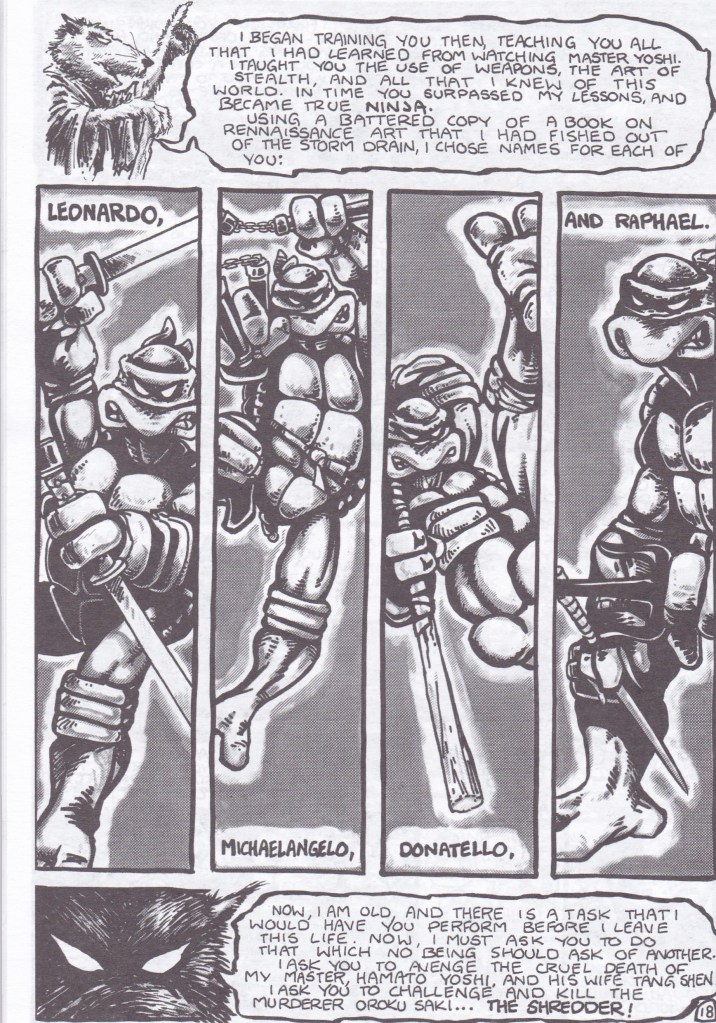 Here’s a sample from the very-first TMNT issue from May 1984, revealing how Master Splinter named each of the four turtles.