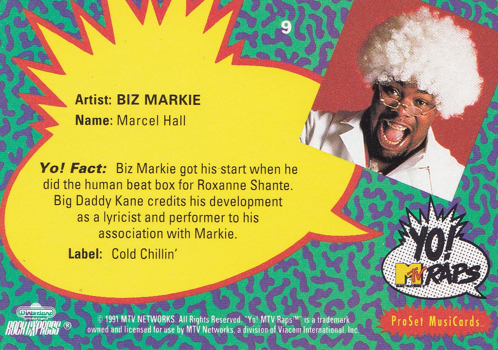 While card fronts are what draw the eyes, they print content on the backs for a reason. Naturally, I flipped the stack over and read each of them not just to check for the errors that Pro Set was prone to make, but as a method of education (which is much more important). Still, I’d hate to read up on a guy only to find out that what I did read was inaccurate, so did I catch any notable errors on these cards? Nothing major jumped out on the fronts, particularly stuff like spelling errors or having a photo that doesn’t match the artist in question. Going card by card, the language used seems a bit simplistic and non-specific in general, making the timeline of certain events as they are listed not very easy to verify or disprove without a great deal of research. There are many times, for instance, where the words “got his start” are used in cases where doubt could be cast. The term can mean anything from when you wrote your first rhyme to when your debut album came out. For example, a Biz Markie card states his was as the human beat box for Roxanne Shante. He technically beat her to market with his debut album Goin’ Off, which was released a year earlier than Shante’s Bad Sister. However, Biz’ own website’s bio section does confirm that his “music scene debut” was, in fact, in the card’s stated context with her Juice Crew. It seems that in his case, when they meant start, they meant it from a career perspective. While I hoped to learn of some earlier demo or group of his own, I wasn’t able to cast doubt on this one.