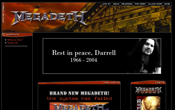 Using Web Archive’s WayBackMachine, I was recently able to find the banner that Megadeth posted on their site in the aftermath of Dime’s death.